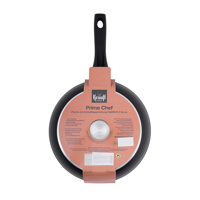Сковорода Prime Chef діаметром 26 см — оптимальний розмір для приготування середніх та великих порцій м’яса, овочів, риби, млинців і гарнірів. Вона поєднує професійну якість, комфорт і стиль, щоб кожна страва виходила ідеальною.