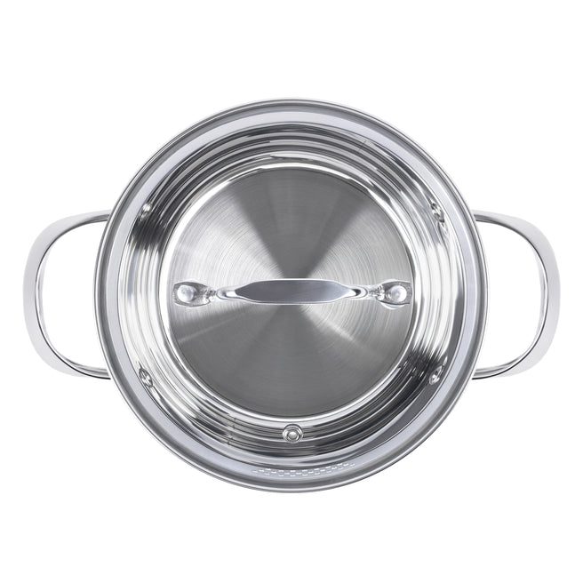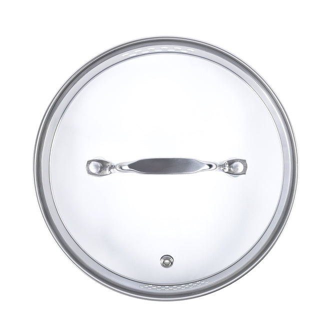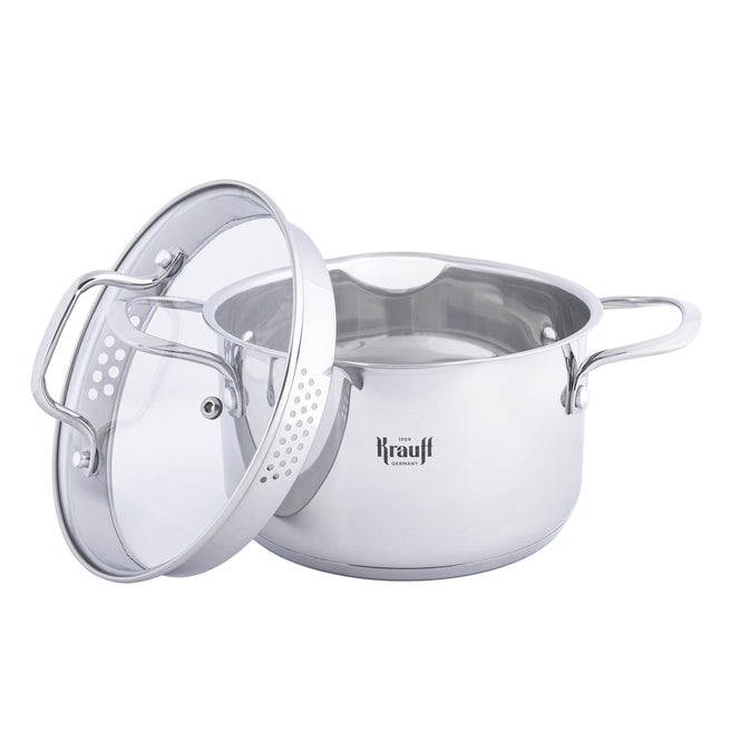Каструля оснащена загартованою скляною кришкою з отвором для виходу пари, що дозволяє стежити за стравою без відкривання — тепло та аромат залишаються всередині. Окрім цього, кришка має фільтр для зливу рідини, завдяки якому можна легко та безпечно злити воду з овочів, макаронів чи бульйону, не знімаючи кришку повністю. Це зручно, швидко та без зайвого клопоту.