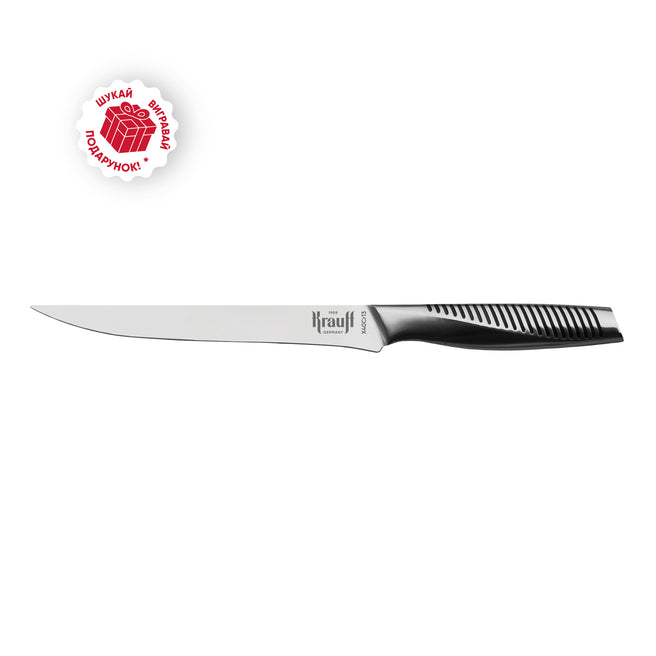 Ніж Krauff Profi 20,8 см — це інструмент, створений для тих, хто цінує ефективність і надійність у кожному приготуванні. Його довге, гостре лезо ідеально підходить для нарізання великих шматків м'яса, забезпечуючи чисті і рівні зрізи.