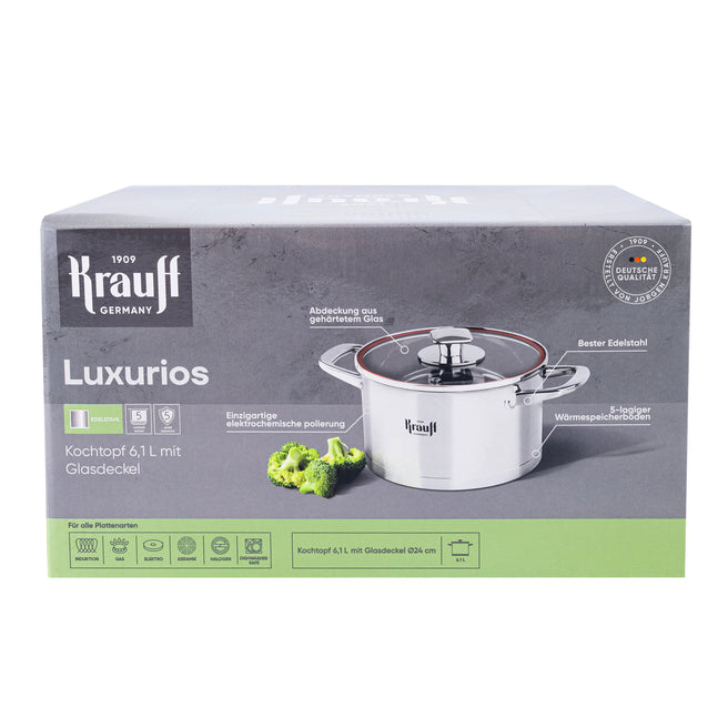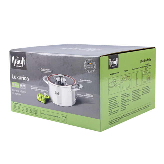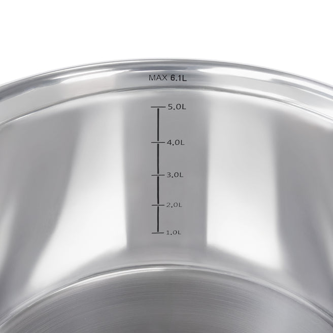 Каструля об’ємом 6.1 л — це потужний інструмент для приготування борщів, супів, бульйонів, тушкованих страв або варіння великої кількості овочів, м’яса чи пасти. Ідеальна для великої родини, святкових страв або заготовок на кілька днів.