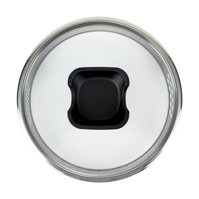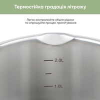 Кришка оснащена отвором для виходу пари, з одного боку має фільтр для зціджування, а зверху — зручну підставку для ложки або шумівки.