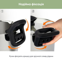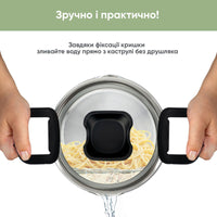 Термостійкі ручки мають функцію згину для фіксації кришки, що дозволяє зручно зливати воду чи бульйон без зайвих інструментів.