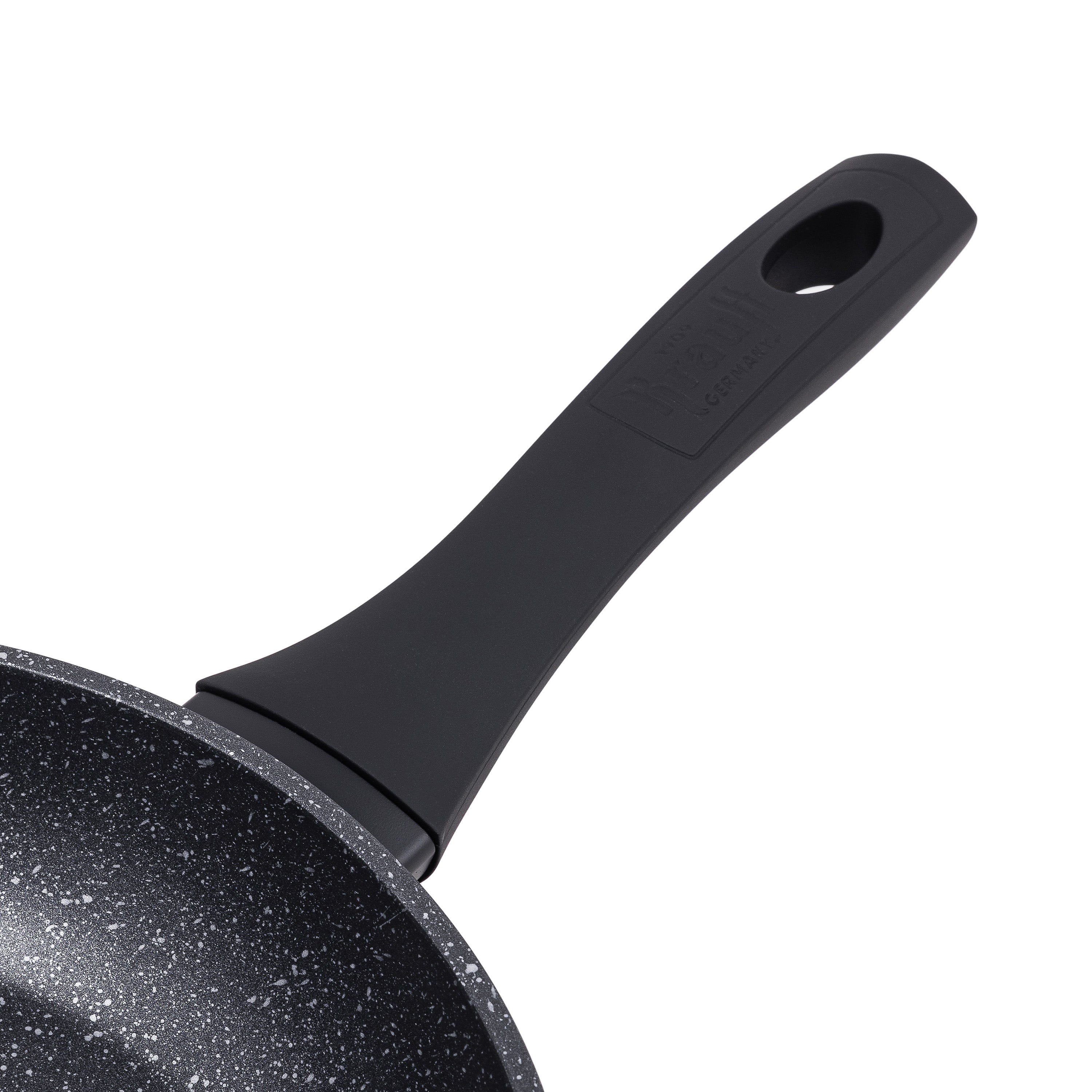 Термостійка бакелітова ручка не нагрівається під час готування та має м’яке софт-тач покриття, що приємне на дотик і забезпечує надійне утримання без ковзання. Зручна форма ручки дозволяє легко контролювати процес — навіть однією рукою.